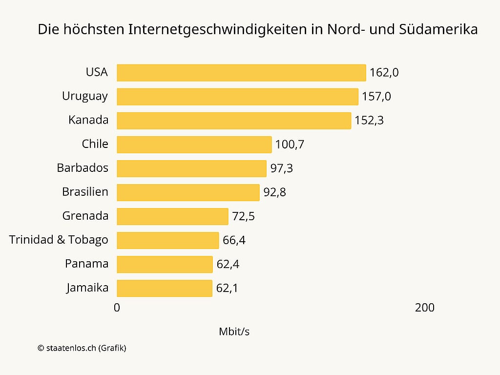 Zum Abschluss betrachten wir Amerika. Hier lohnt ein kombinierter Blick auf Nord-, Mittel- und Südamerika, da die amerikanischen Doppelkontinente in Sachen Internetgeschwindigkeit heterogen sind. In Nordamerika sind die USA und Kanada lange die Platzhirsche gewesen, aber in Südamerika holt insbesondere die südliche Spitze (Chile, Uruguay) stark auf. Die Top 10 nach Durchschnittsgeschwindigkeit: