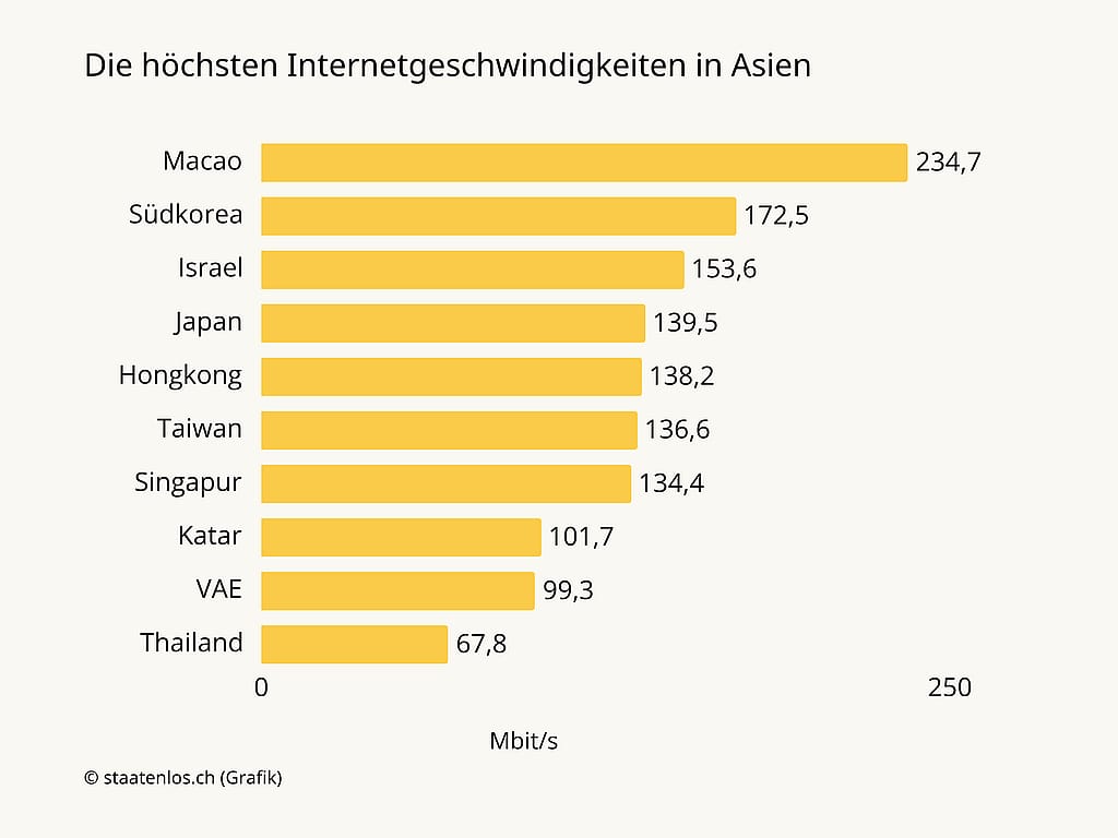 Die großen Bevölkerungsländer Indien und Indonesien kommen gar nur auf 19,5 Mbit/s bzw. 45,9 Mbit/s – hier sind weite Teile der Bevölkerung noch mit langsamen Mobilverbindungen online. Insgesamt zieht Ostasien dem Rest des Kontinents davon. Interessant ist aber, dass einige Stadtstaaten bzw. Regionen (Macao, Hongkong, Singapur) dank kompakter Größe enorme Werte erzielen. Asien hat somit einerseits absolute Spitzenreiter, anderseits viele Länder mit Nachholbedarf – die digitale Schere ist hier vergleichsweise groß.