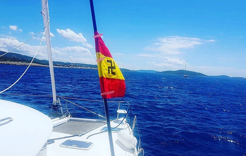 Die SY Staatenlos hat neben den anarchokapitalistischen Segeln auch ein breites Sortiment an Flaggen der Freiheit. Die schwarze Swastika auf gelb-roten Grund weist uns deshalb nicht als Nazis aus, sondern Bewunderer der Kuna Yala Kultur, deren Nationalsymbol es ist (San Blas Inseln in Panama, das unser Refugium in der Hurrikan-Zeit in der Karibik wird). Passend zu den Segeln lassen wir meist eine schwarz-gelbe Gadsden/Jolly Roger Flag mit Schlange/Totenkopf wehen. Jede Kabine verfügt übrigens auch über “Dont Tread On Me”-Handtücher.