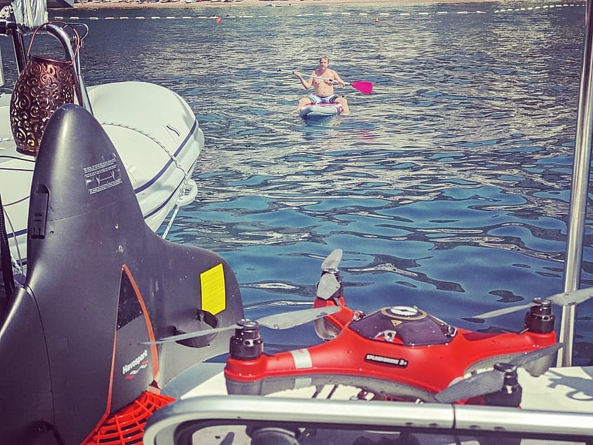Neben der Unterwasser-Drohne haben wir auch 2 Flugdrohnen an Bord, die die grandiosen Luftbilder von unserer SY Staatenlos anfertigt. Eine kleine DJI Mavic wird dabei ergänzt von einer großen Swellpro Splashdrone 2+, die sogar auf dem Wasser landen und 30cm unter Wasser aufnehmen kann. Sie kann sogar in Regen und starken Brisen noch sicher fliegen und filmen.