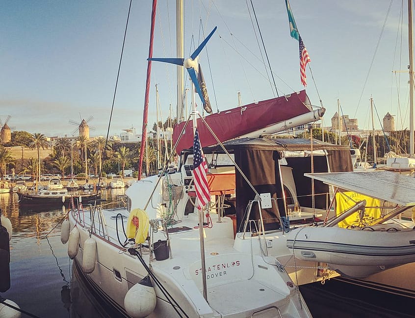 Die “SY Staatenlos” ist ein Katamaran der französischen Werft Lagoon in Bordeaux. Lagoon ist eine sehr bekannte Katamaran-Marke und unser Modell 380 eines seiner populärsten mit fast 800 Bestellungen. Aktuell wird der 380er nicht mehr produziert, erfreut sich aber weiterhin reger Beliebtheit auf den Gebraucht-Märkten. Wir haben bewusst einen älteren Lagoon (Baujahr 2006) gewählt, da die älteren Modelle in unseren Augen stabiler gebaut und besser geschnitten sind. Bei einem Schiff ist das Alter der Hülle relativ egal, solange diese keine groben Schäden aufweist. Den guten Zustand unseres Lagoon 380 haben wir uns vor dem Kauf bereits von einem erfahrenen Surveyor bestätigen lassen. Machen lassten mussten wir bisher nur kleinere Gelcoating-Arbeiten und ein neues Antifouling.