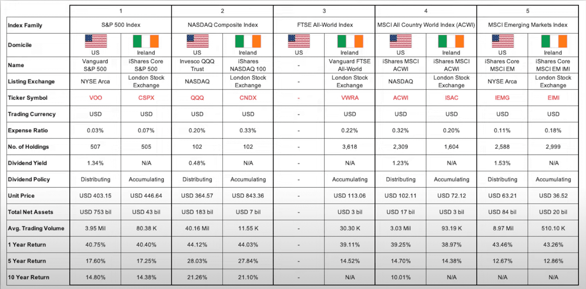 Hier noch eine Übersicht von US und Irischen-ETFs: