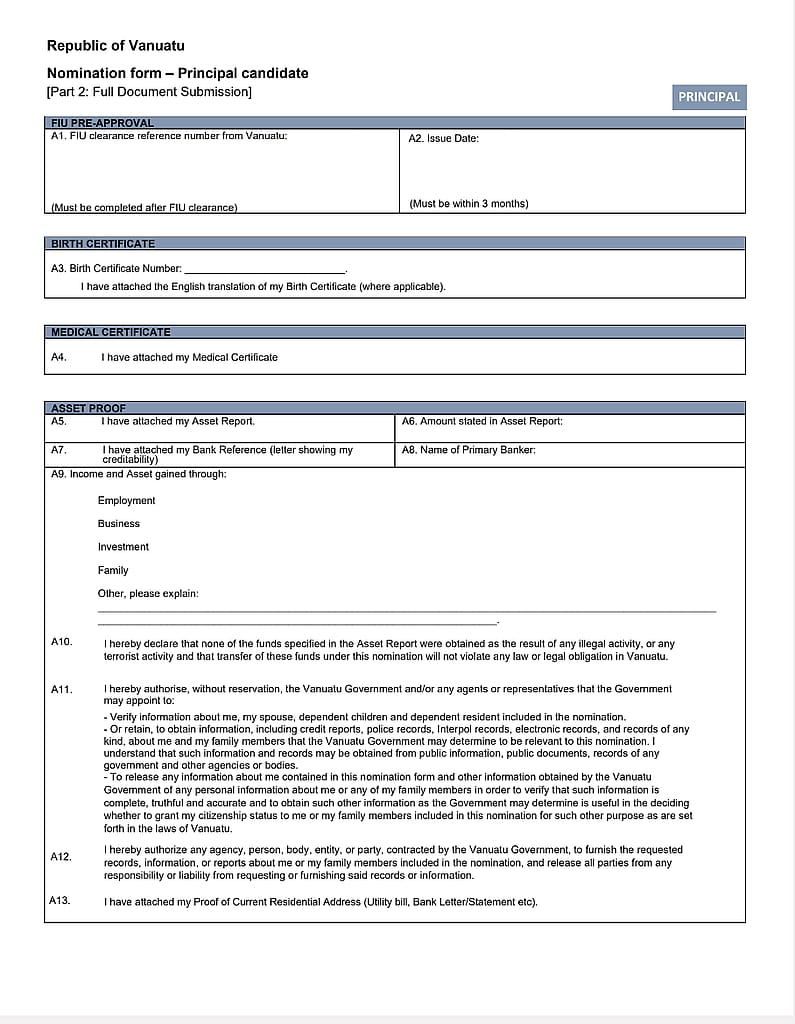 Phase 1 ist die Vorabgenehmigung durch die Financial Intelligence Unit Vanuatus. Diese FIU-Clearance dauert maximal 96 Stunden nach Einreichung und gibt eine klare Antwort, ob man eingebürgert werden darf oder nicht. Wer hier eine Genehmigung bekommt, hat in der Regel auch zu 100% die Staatsbürgerschaft sicher, solange er die weiter nötigen Dokumente der Phase 2 auftreibt. Im Folgenden schauen wir uns die Dokumente der Phase 1 einmal genauer an: