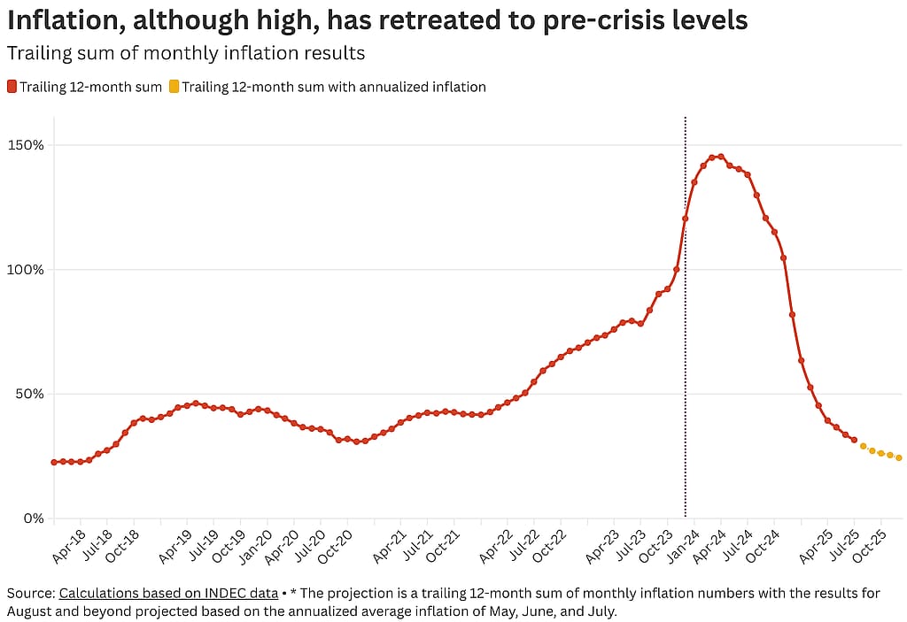 Nach dem anfänglichen Schock ist auch die Teuerungsrate drastisch gefallen – von über 200 % im Jahr 2023 auf etwa 30 % jährlich. Ein Minus von fast 15 Prozentpunkten in anderthalb Jahren. Mehr Beweise dafür, dass man keine Wunderformeln braucht, sondern schlicht logisches und konsequentes Handeln, gibt es wohl kaum.