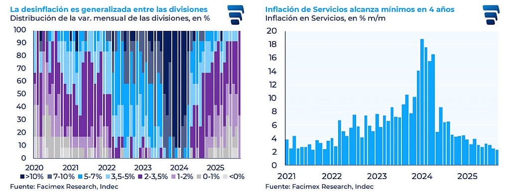 Die Kerninflation in Argentinien ist im September 2025 wieder unter die Marke von 2 Prozent im Monat gefallen und liegt mit 1,9 Prozent sogar noch 0,1 Prozentpunkte unter dem August. Das ist der beste Wert seit 2018. Auch im Dienstleistungssektor sind die Preissteigerungen auf ein Vierjahrestief gesunken. Die linke Grafik zeigt die Inflationsbänder nach Produktgruppen und zum ersten Mal liegen sämtliche Bereiche unter 3,5 Prozent pro Monat. Der Abwärtstrend ist klar, stabil und bisher ungebrochen.