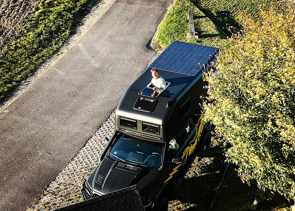 Interessant ist auch die Tür zwischen Dusch- und Wohnkabine. Diese ist so konzipiert, dass sie voll geöffnet eine undurchlässige Trennwand zum Fahrerhaus und Schlafkabine bildet falls einmal Privatsphäre wünschenswert ist. Die Schlafkabine befindet sich im Alkoven mit vielen lichtdurchflutenden Fenstern und einfachen Ausstieg auf das Dach mit begehbaren Solarzellen. Mit entsprechenden Kissen eine wundervolle Terasse auf fast 3m Höhe.