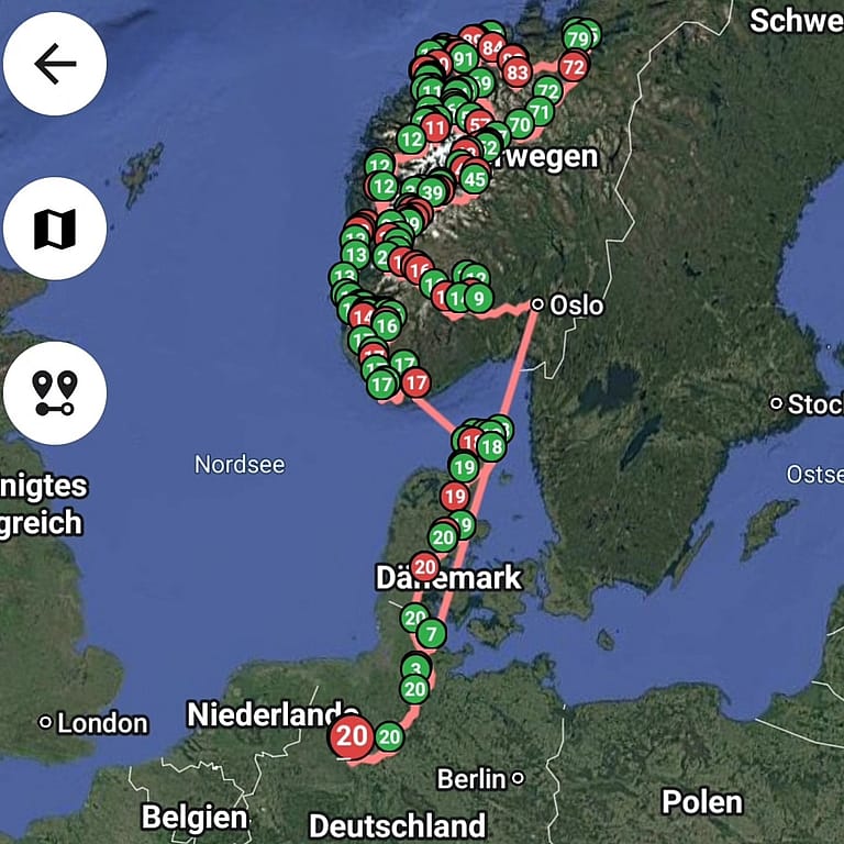 Trotz kleinerer Kompromisse freuen wir uns sehr die Welt mit unserem Expeditionsmobil zu erkunden. Auf Camping-Plätzen wird man uns dabei eher selten finden. Wir wollen schließlich niemanden mit dem V8-Sound verstören – oder aufwecken. Wo immer legal oder zumindest ungefährlich werden wir freistehen. Deshalb haben wir als erste große Reise auch Norwegen mit seinem Jedermannsrecht und legalen Wildcampen auserkoren. Unsere Route mit rund 5000 km in rund 2,5 Wochen siehst Du hier: