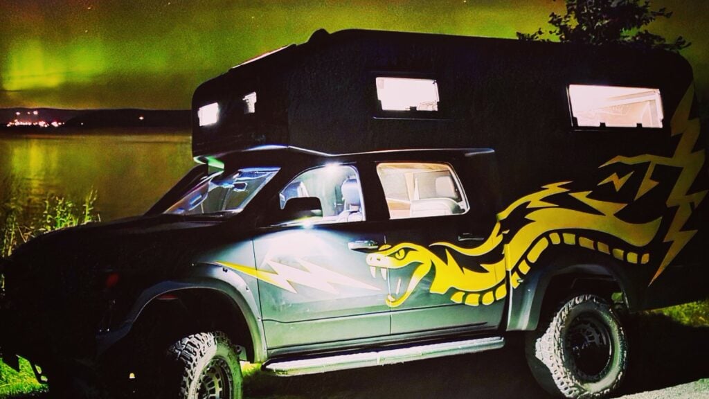 Innen mit warmen Licht und leichten, aber edlen Materialen gesegnet sieht unser Expeditionsmobil nach außen hin typisch “Staatenlos” aus. Wir haben uns für eine matte grauschwarze Lackierung entschieden, die besonders kratzfest ist. Unser schwarzgelben Farben werden durch eine gelbe Folierung einer Schlange ergänzt, die aus einem Blitz hervorgeht. Auf Text verzichten wir bewusst, werden im Alkovenvorder- und Rückfenster aber ein austauschbares Staatenlos-Plakat plazieren wann immer uns danach ist.
