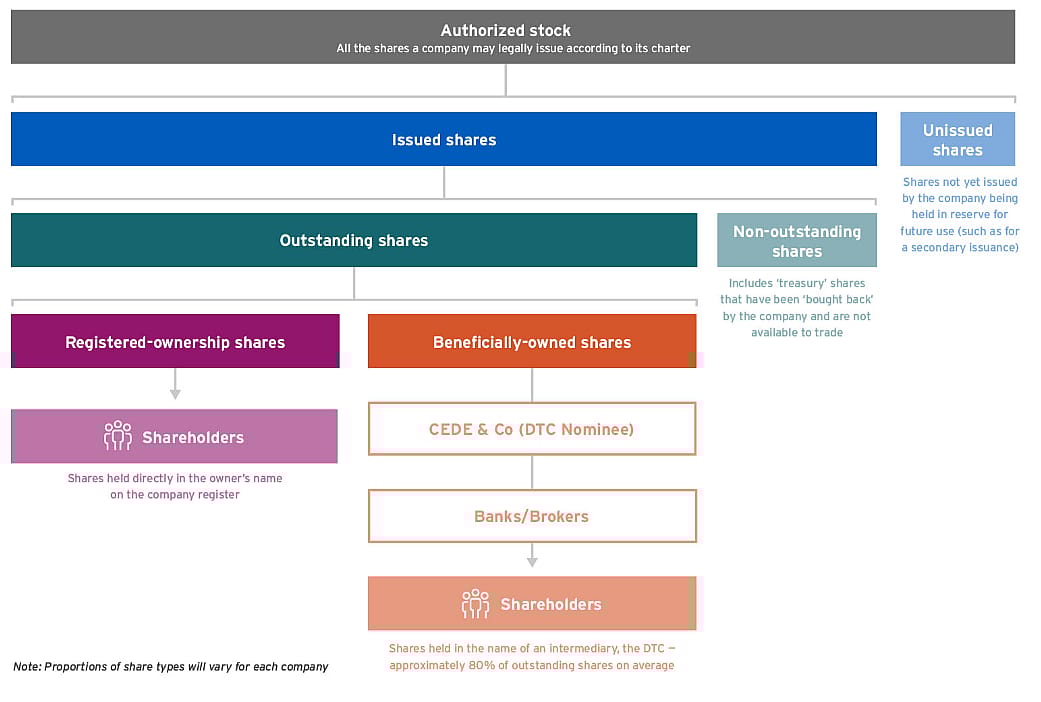 Kurz gesagt: Mit Zentralverwaltern wie Clearstream & Co. gehörst Du zur anonymen Masse „Kunde eines Brokers, der Teilnehmer eines Zentralverwahrers ist“. Mit DRS/Computershare bist Du wieder das, was Anleger intuitiv glauben zu sein: namentlich eingetragener Aktionär, mit einem Registereintrag, der nicht von Deinem Broker oder Zentralverwahrer abhängt. Das ist zwar ein gewisser Aufwand, lohnt sich aber. Das Schaubild unten für den US-Markt verdeutlicht dies nochmals.