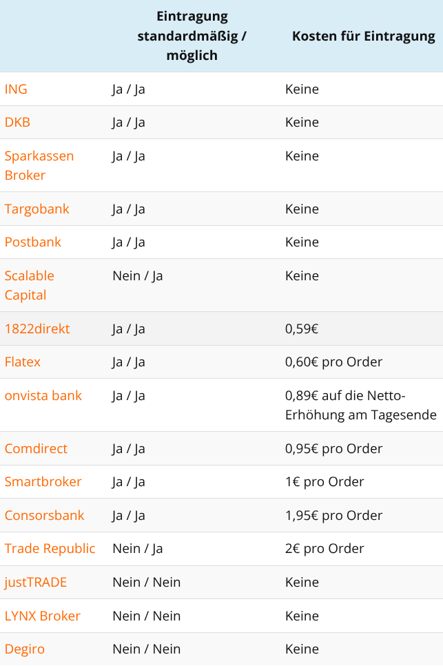 Deutsche Banken mit Depots wie DKB, Commerzbank und Deutsche Bank wie auch zb Flatex bieten weiterhin standardmäßig registrierte Namensaktien an. Bei einigen beliebten Online-Brokern ist das aber nicht der Fall. Trade Republic, und Scalable Capital registrieren Namensaktien etwa nur auf Wunsch mit Zusatzkosten. Discount-Broker wie Degiro.com oder Lynxbroker bieten noch nicht einmal die Möglichkeit dazu an – sie werden immer im Street Name mit Dir als reinen Forderungsinhaber gehalten. Folgende Tabelle gibt eine gute Übersicht zum Thema