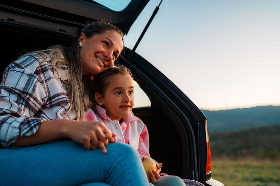 Mutter und Tochter genießen die Natur auf Reisen in ihrem Auto